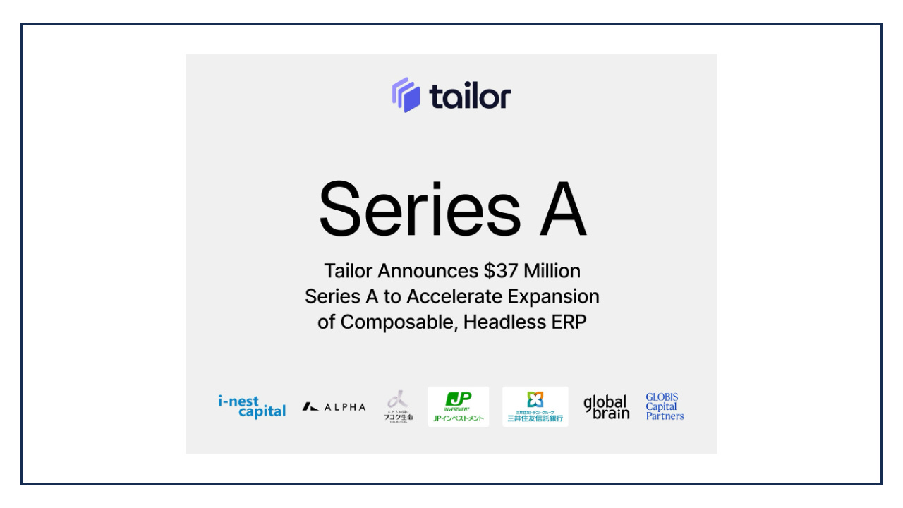 Tailor Technologies, a provider of a headless ERP platform, has completed its Series A funding round with an additional close, bringing the total raised to 37 million USD (approximately 5.5 billion JPY).